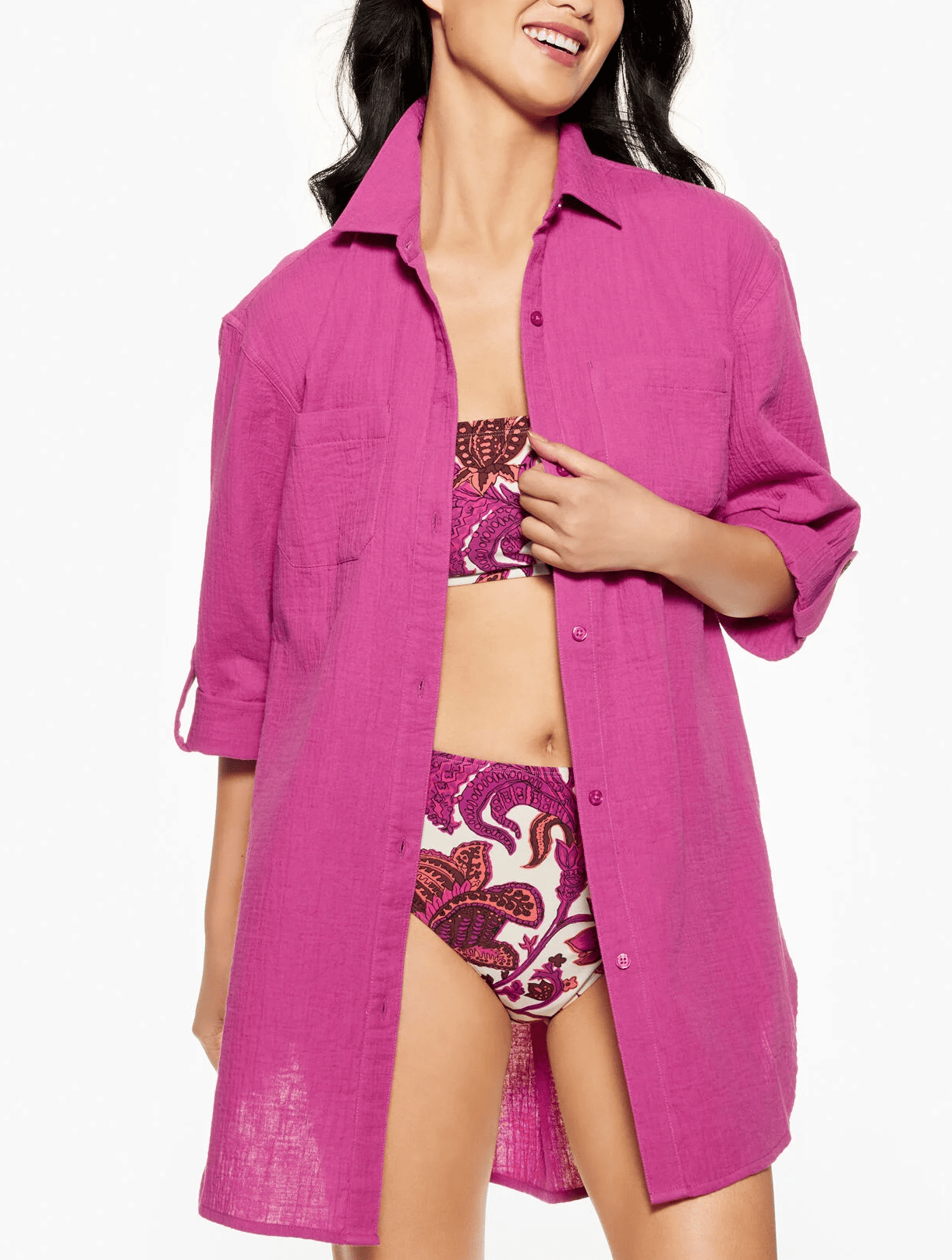 This Aqua Membership Gauze Cowl-Up is effortlessly light-weight, making it excellent for warm-weather days. I like this cool-toned pink for spring and summer time. The button-front design offers you choices: put on it open for a breezy layer over your swimsuit or button it up once you need a little bit extra protection.