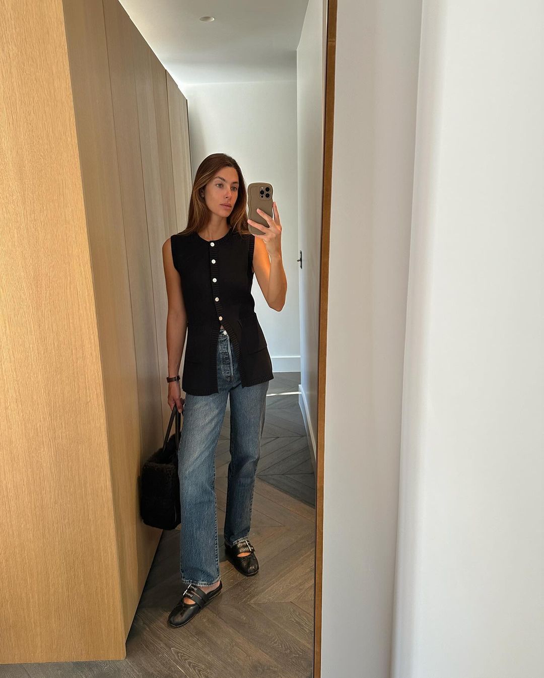 Model Notes: “Denims and a pleasant high” is a foolproof choice in the case of choosing a brunch outfit. Above, Jaime Ridge types a pair of light straight-leg denims with a knitted longline waistcoat and ballet flats for a traditional daytime look.