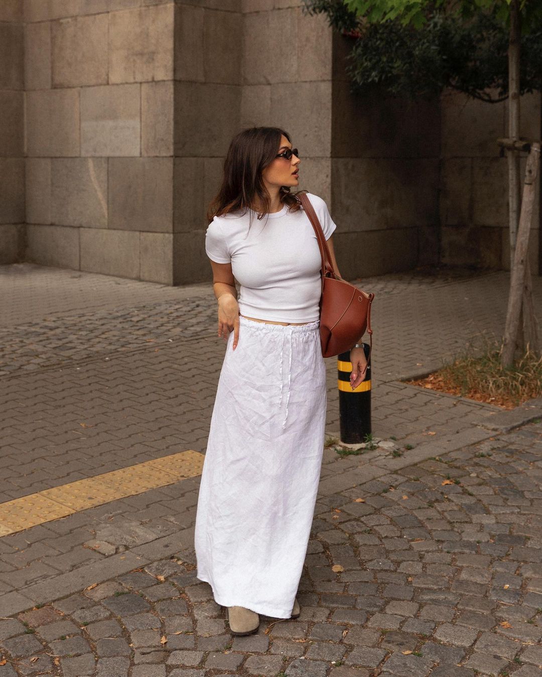3. T-Shirt + White Skirt + Clogs