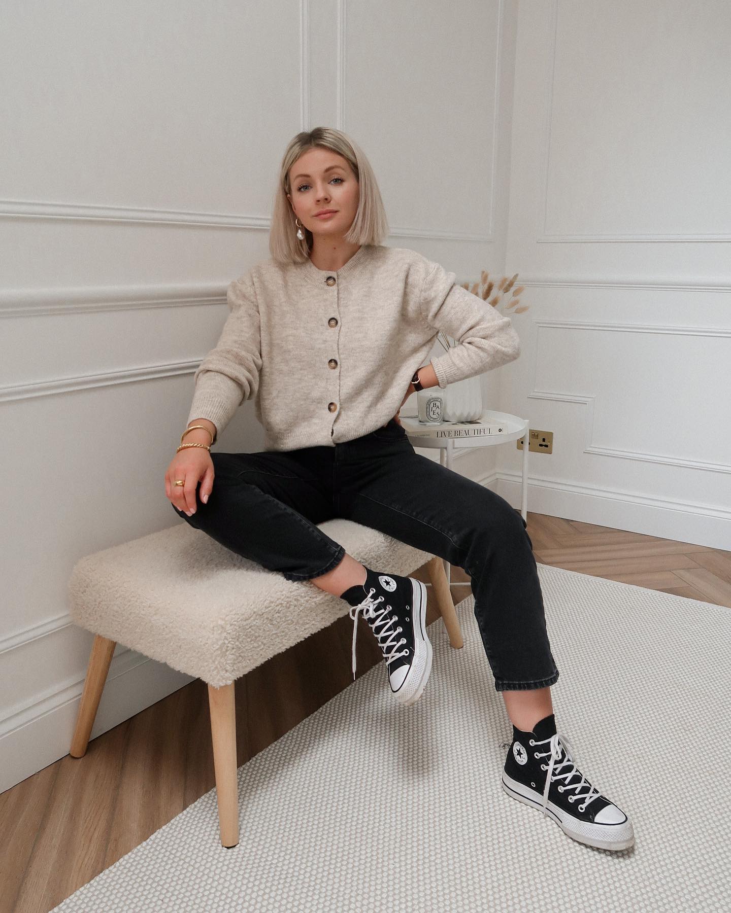 Need to elongate your legs as a petite? Attempt a barely cropped cardigan with high-rise pants to let your legs actually shine. Then pair the ensemble with high-top sneakers and even with some chunky sneakers. It’s a low-key look that appears polished nonetheless and it’s tremendous straightforward to personalize together with your favourite layered rings and minimalist earrings.