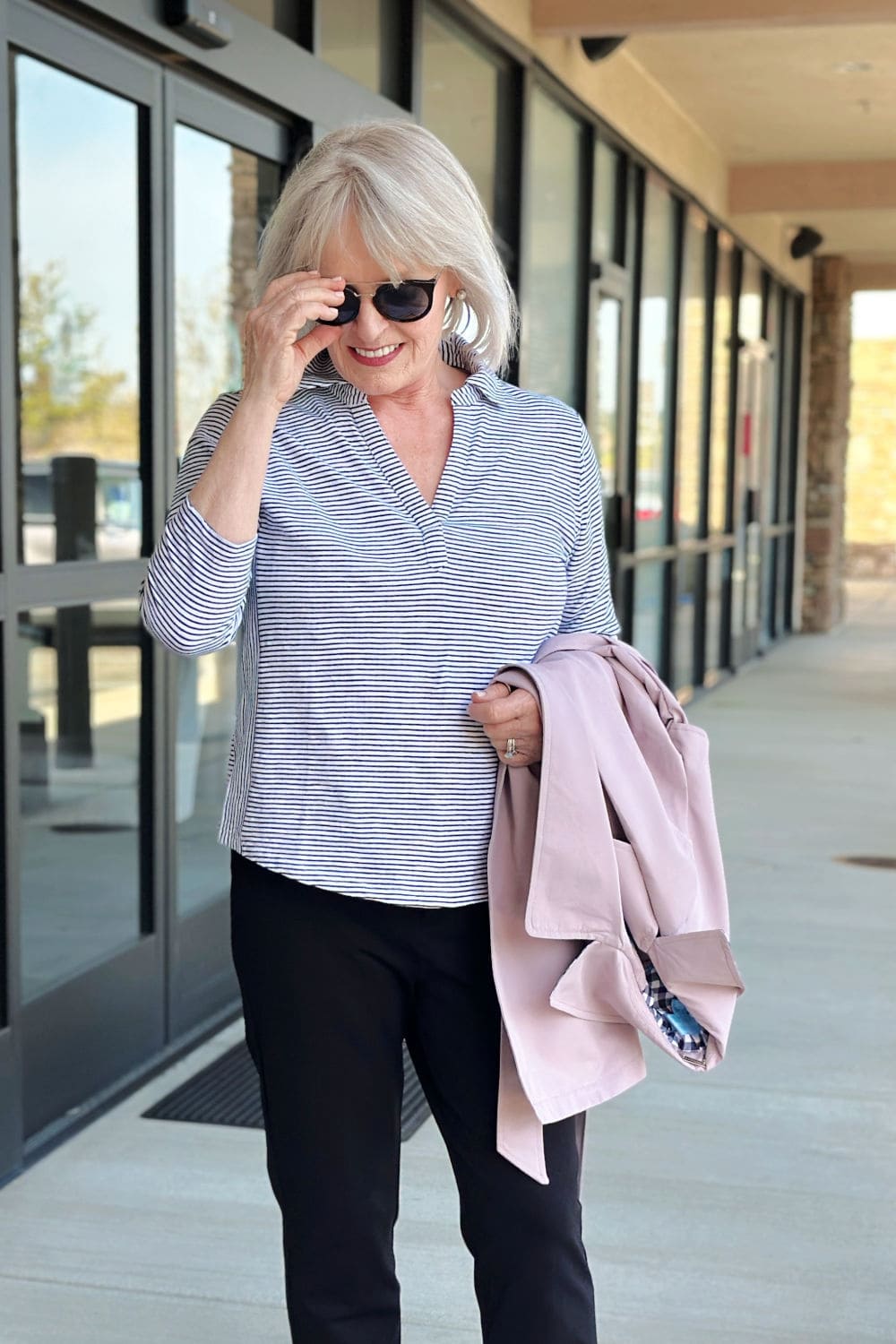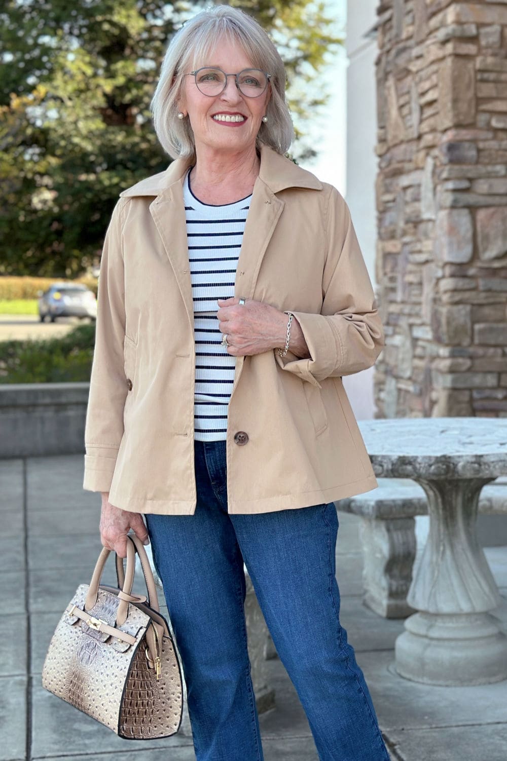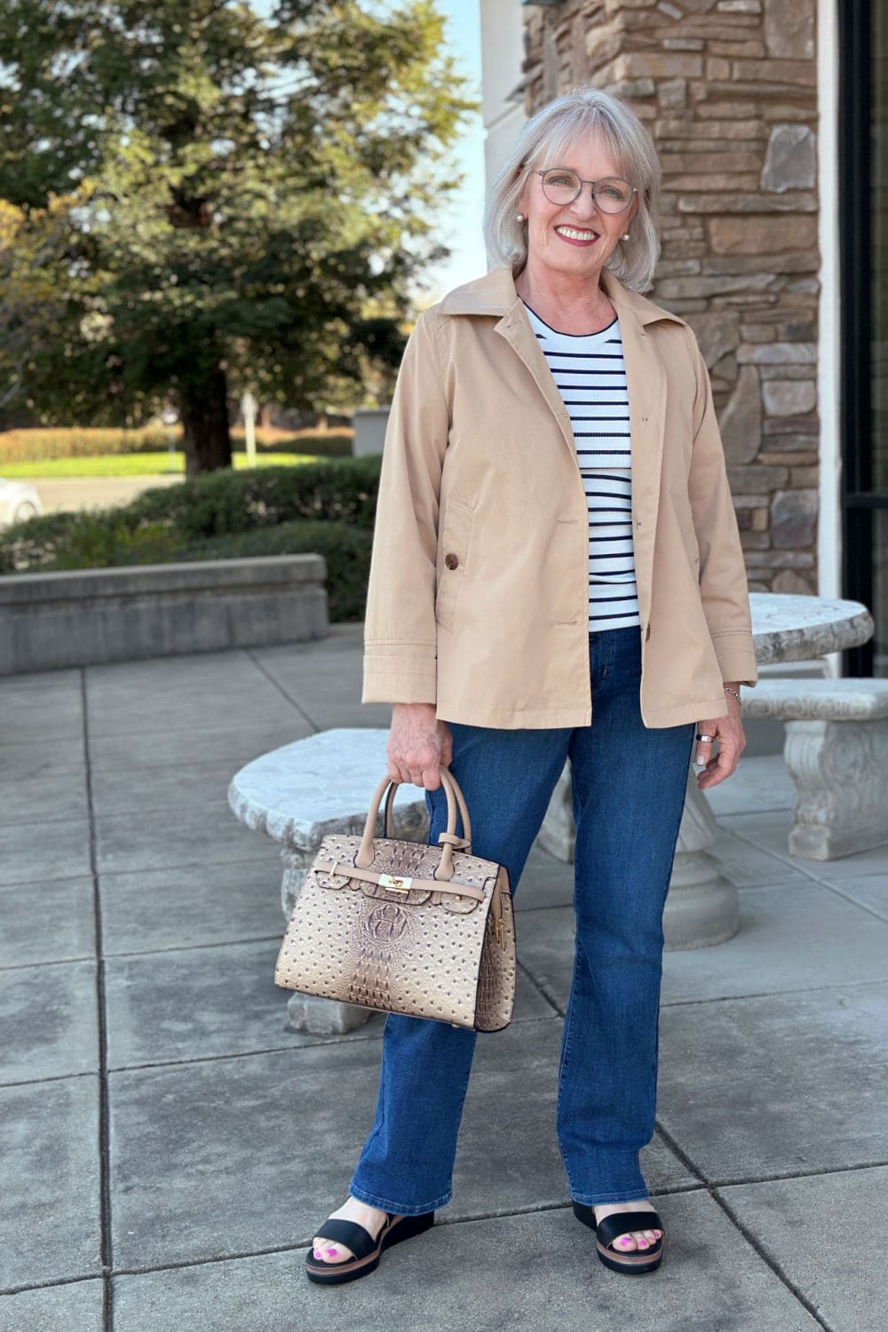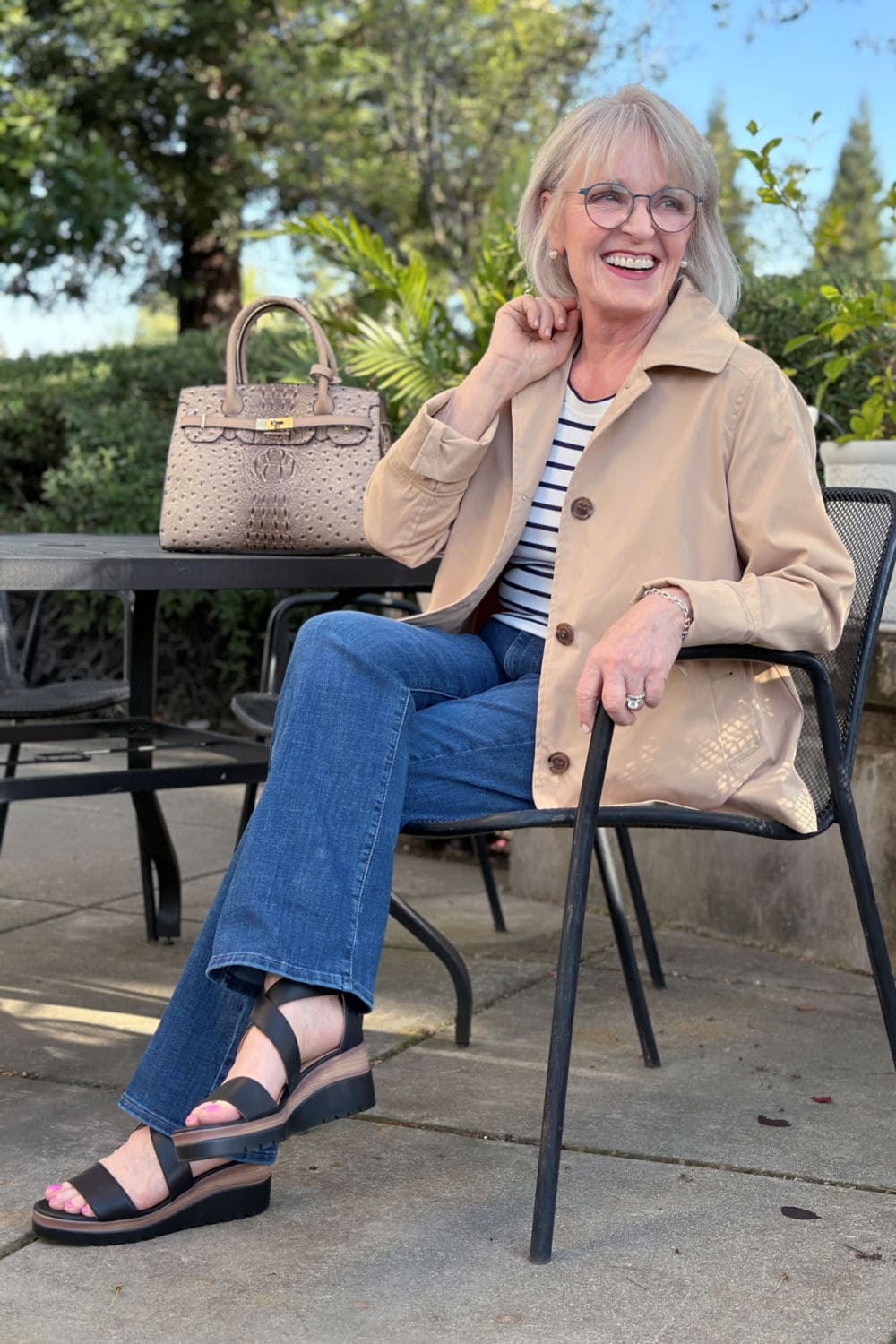 I paired it with a basic navy-and-white striped prime and dark-wash denims for a timeless, informal look. The structured purse and wedge sandals elevate it simply sufficient to really feel polished, whereas nonetheless being extremely straightforward to put on.