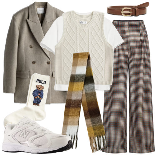 Grandpacore favors mixing and matching, so layering a plaid scarf (that has a contrasting print to the pants) will give the outfit the aesthetic’s signature eccentricity.