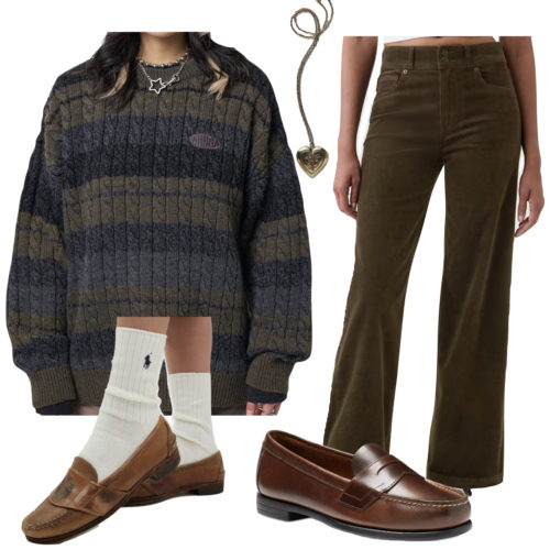 This striped cable-knit sweater with an outsized match, wool-blend material, and an earthy colour palette seems to be prefer it may have been plucked out of your grandpa’s closet. Put on it with some brown corduroy wide-leg pants and a few traditional brown leather-based loafers. Add to the coziness with some ribbed knit crew socks, and decorate with a vintage-looking coronary heart locket necklace.