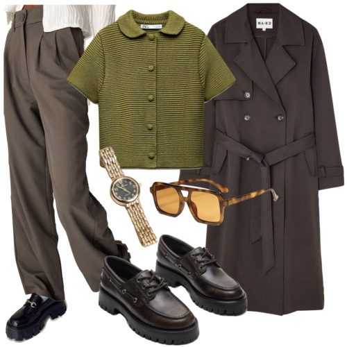 I like the way in which this darkish brown trench coat seems to be when paired with some brown trouser pants and an earthy inexperienced short-sleeve cardigan. The trousers characteristic a menswear-inspired design with a relaxed match, whereas the cardigan has a kitschy, selfmade look with its chunky, crochet-like knit and Peter Pan collar.