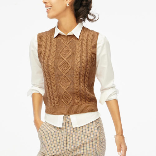 Probably the greatest layering items for the grandpacore aesthetic is, surely, a cable-knit sweater vest. These not solely are a favourite of grandpas, however they’re wonderful for layering each over and below different clothes items that will help you obtain an eclectic look.