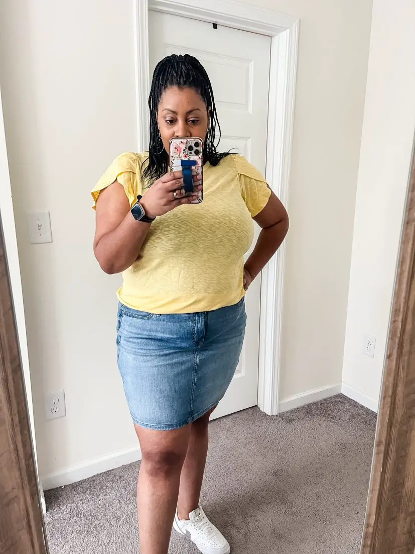This denim mini skirt could be very stretchy which is sweet nevertheless it’s not my favourite.  It’s excessive rise which is nice however there’s no construction on the prime of the waist and I’d really feel way more snug carrying shapewear beneath.