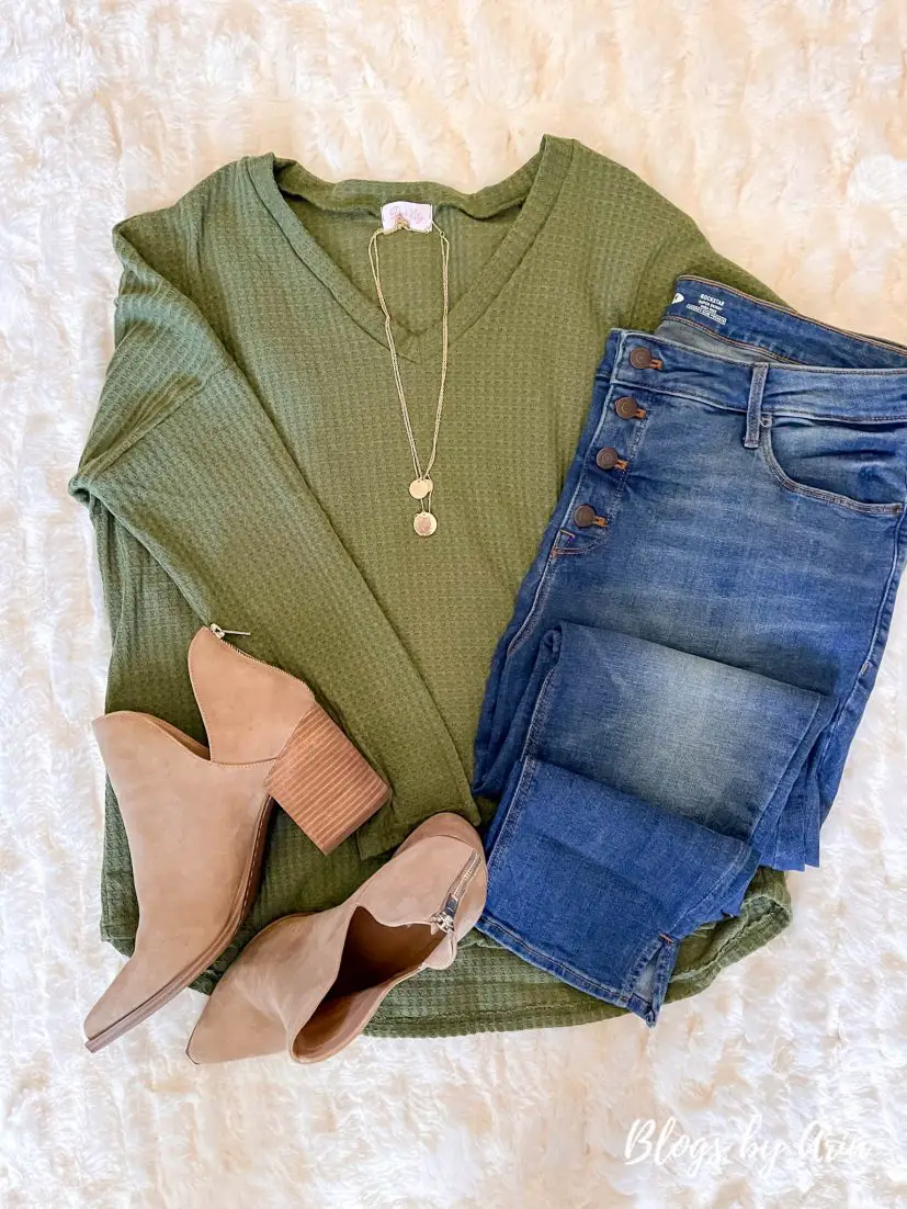 peplum waffle knit shirt | button fly denims | Cedar booties