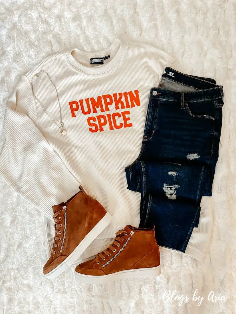 Pumpkin Spice Corded Sweatshirt | necklace | denim denims | wedge sneakers