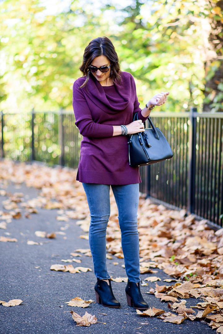 THEN (2017): cowl neck tunic (S) // gray skinny denims // rag & bone booties (39) // Rebecca Minkoff satchel // wrap bracelet // related sunnies