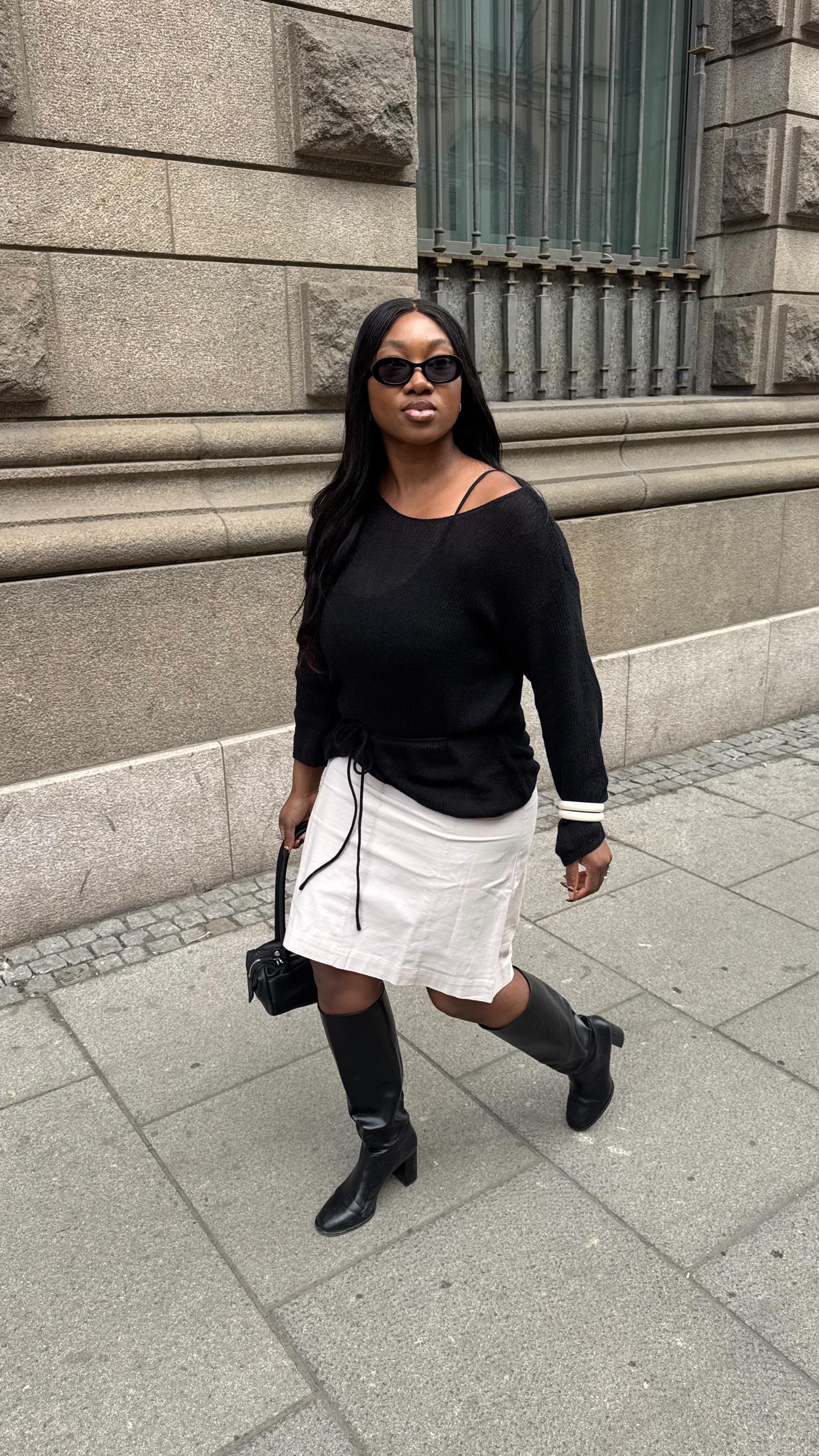 Fashion with leather-based boots and a chunky sweater for a glance impressed by The Row.